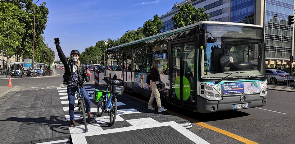 Per a promoure l’ús de la bicicleta en el context del desconfinamiento, el DiRIF volia crear un carril bici unidireccional en el tram de la RN13 que administra. A causa de l’important flux de vehicles en aquest eix, era fonamental, per a la seguretat dels ciclistes, implementar una solució que permetés una gestió òptima en les parades de les àrees de trobada entre ciclistes i usuaris d’autobusos.