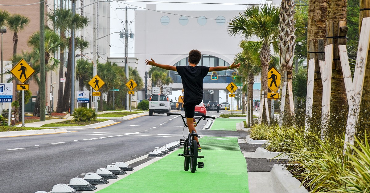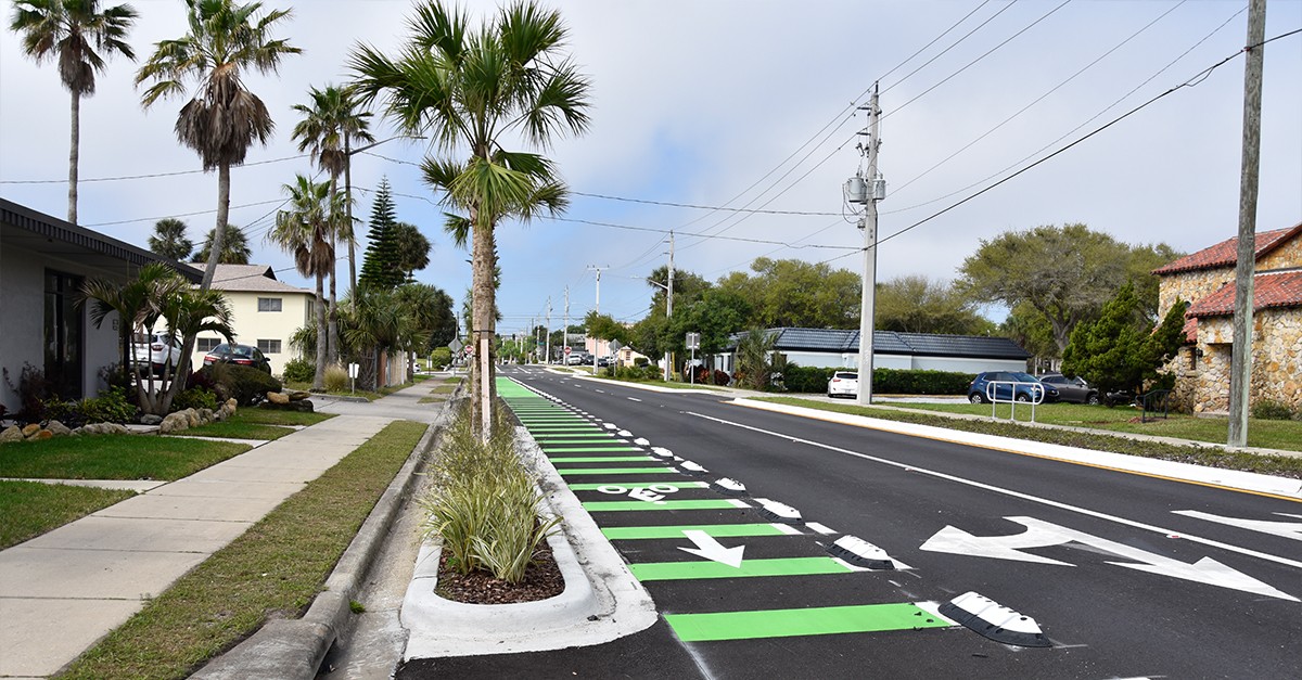 The Florida Department of Transportation (FDOT) undertook a project to improve safety on Oakridge Boulevard in Daytona Beach. The street was redesigned to reduce the number of motorized traffic lanes from three to two and to create a 6.98ft-wide segregated cycle lane. The project also included measures to enhance the safety and comfort of pedestrians and cyclists, such as refurbishing existing sidewalks and improving safety for cyclists and pedestrians at intersections.