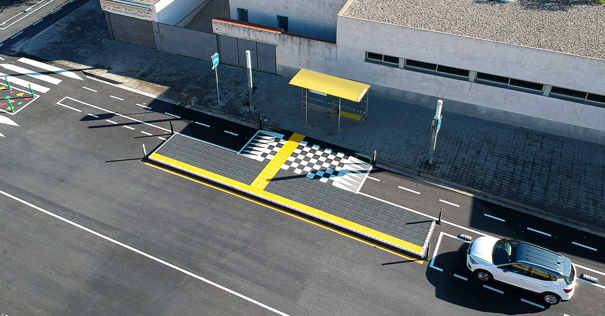 Además, se instalaron dos plataformas del sistema Vectorial® en aquellas ubicaciones donde el carril bici coincidía con una parada de autobús. Ambas plataformas tienen un carril bici integrado y una de ellas tiene puente de acceso. De esta manera, se garantiza la accesibilidad de la parada de autobús y la seguridad de ambos, por un lado, el de los usuarios del autobús y, por otro lado el de los usuarios del carril bici.