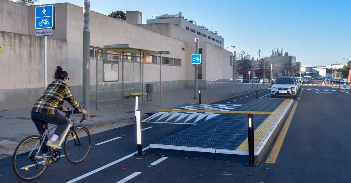 En el proyecto también se buscaba maximizar las prestaciones de seguridad viaria y garantizar la convivencia de peatones y ciclistas en las paradas de bus que coincidían con el carril bici, todo ello con el mínimo de inversión.